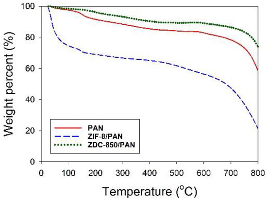 Figure 3 displays the TGA profiles of PAN, ZIF-8/PAN, and ZDC-850/PAN samples in a nitrogen atmosphere. Approximately 60% of PAN and 70% of ZDC-850/PAN remained when the samples were heated to 800 °C under a nitrogen atmosphere. On the other hand, the ZIF-8/PAN composites had a rapid weight loss before 100 °C, but the weight was stable up to approximately 500 °C under flowing nitrogen, and approximately 20% of the ZIF-8/PAN remained after it was heat treated at 800 °C under a nitrogen atmosphere. The TGA profiles illustrate that the embedding of ZDC-850 into PAN-based carbon nanofibers could enhance the thermal stability of the carbon nanofibers. However, the introduction of ZIF-8 in nanofibers decreased the stability.