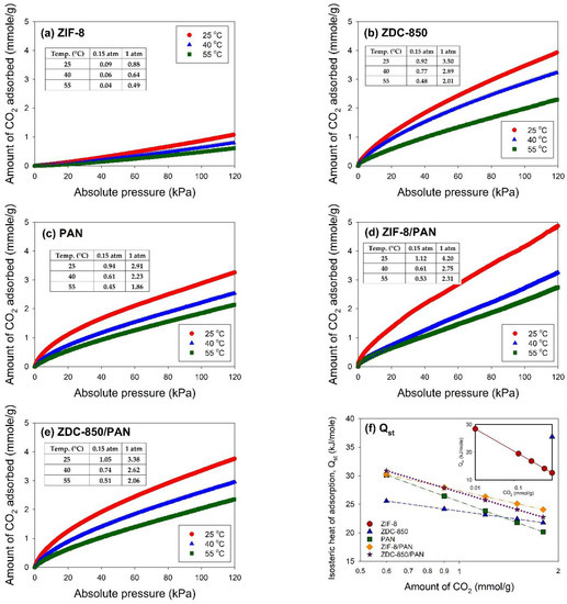 The CO2 adsorption isotherms for all samples under a pressure of less than 123 kPa at 25, 40, or 55 °C are shown in Figure 7. An equilibrium duration of 45 s was maintained for each measurement point, after achieving the set pressure value. The CO2 uptake increased with increasing CO2 pressure, but decreased with increasing adsorption temperature, manifesting the characters of the exothermic reactions. As seen from Figure 7a, the CO2 uptakes of the as-prepared ZIF-8 seemed not to behave well under atmospheric pressure. The CO2 adsorption capacities at 25 °C and 1 atm followed the order: ZIF-8/PAN (4.20 mmol/g) > ZDC-850 (3.50 mmol/g) > ZDC-850/PAN (3.38 mmol/g) > PAN (2.91 mmol/g) > ZIF-8 (0.88 mmol/g). At 25 °C and 0.15 atm (a typical untreated flue gas composition), the CO2 uptakes had a different order: i.e., ZIF-8/PAN (1.12 mmol/g) > ZDC-850/PAN (1.05 mmol/g) > PAN (0.94 mmol/g) > ZDC-850 (0.92 mmol/g) > ZIF-8 (0.09 mmol/g).