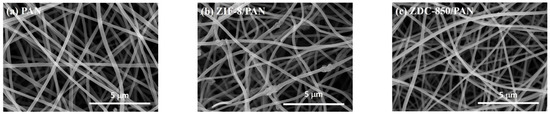 Nanofiber composites were prepared using an electrospinning process. Initially, PAN was dissolved in DMAc to form a polymer solution with 10 wt.% PAN. The resulting solutions were subjected to continuous magnetic stirring at 60 °C for 24 h in order to obtain a homogeneous polymer solution. Next, ZIF-8 (or ZDC-850) with a ratio of 10 wt.% of ZIF-8 (or ZDC-800) to PAN was added into the polymer solution and continuously stirred for 24 h at room temperature. Electrospinning equipment (FES-COE, Falco Tech Enterprise Co., Ltd., Taiwan) was used for fiber electrospinning. The electrospinning was carried out under an applied electrical voltage of 15 kV onto a metal drum collector (∅ 15 cm) rotated at 300 rpm and covered with aluminum foil, and a tip-to-collector distance of 15 cm was used. The mixture solution was pumped at a flow rate of 1.0 mL/h, pushed by a syringe pump (NE-1000, New Era Pump Systems, Inc., Farmingdale, NY, USA). A 21-gauge needle (inner diameter: 0.52 mm) was selected.