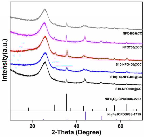 The crystalline phases of NFO@CC and S10-NFO@CC nanomaterials were investigated by XRD. As shown in Figure 2, NFO400@CC displayed the same crystal structure as NiFe2O4 (JCPDS: 86-2267), and some extra diffraction peaks of NFO700@CC matched by FeNi3 (JCPDS: 65-5131), which shows the high-temperature calcination forms a new phase inside the NFO700@CC. Additionally, S10-NFO@CC displayed the same crystal structure as the corresponding NFO@CC, which implies the low-temperature sulfurization could not further introduce new phases inside the NFO@CC precursor [25].