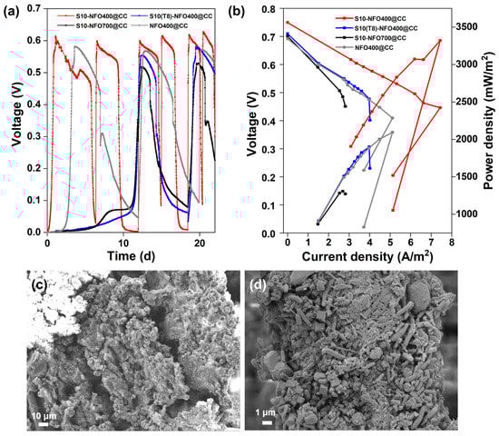After four cycles of the voltage generation, polarization and power density curves of anodes were tested and shown in Figure 3b. The open-circuit potential of the S10-NFO400@CC anode was the highest value (0.75 V), followed by S10(T8)-NFO400@CC anode (0.71 V), S10-NFO700@CC (0.70 V), and NFO400@CC anode (0.69 V). The maximum power density generated by the S10-NFO400@CC anode was 3320.78 mW m−2 with 300 Ω of external resistance (Figure 3b, red curve), 1.6 times more than with the NFO400@CC anode (2095.66 mW m−2, external resistance: 400 Ω, gray curve). On the contrary, the maximum power density generated by S10(T8)-NFO400@CC anode was 1901.05 mW m−2 with 600 Ω of external resistance (blue curve), a 9.3% decrease compared to the NFO400@CC anode. The maximum power density generated by the S10-NFO700@CC anode was 1306.74 mW m−2 with 900 Ω of external resistance (black curve), 0.62 times that of the NFO400@CC anode. Figure 3c,d show biofilms enriched on S10-NFO400@CC and S10(T8)-NFO400@CC, respectively. The morphology of the nanosheets was covered as the growth of the biofilm. Different bacteria wrapped around the anode and promoted EET, leading to stable electricity generation. To sum up, the S10-NFO400@CC surface has a higher EET ability, obviously improving the power generation of MFC.