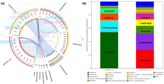 As seen in the visual heatmap comparison (Figure 5a), the microbial community of anode biofilm was similar to that of suspension in the same MFC, while there were some variations in microbial community compositions at the genus level in response to different anode materials. Figure 5b specifically analyzes the differences in genus-level bacteria between those two planktonic bacteria. Compared to planktonic_CC, a significant increase in the relative abundance of 11 bacterial taxa and a significant decrease in 4 bacterial taxa were observed in planktonic_S10. Particularly, Desulfovibrio, Lentimicrobium, Petrimonas, and f_PHOS-HE36 were significantly enriched in planktonic_S10. Tepidiphilus, f_Rhodocyclaceae, Geobacter, and Microbacter were suppressed.