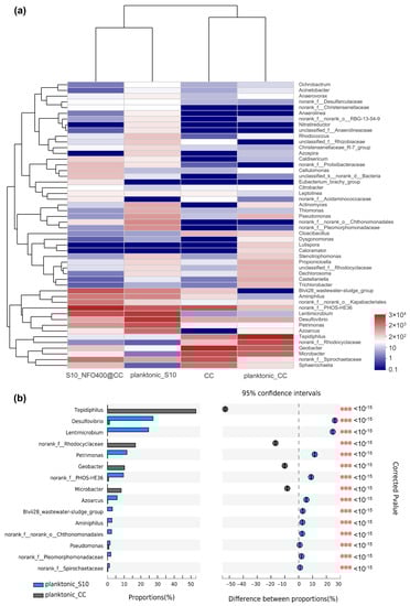 (a) The heatmap of the most abundant genera for anode biofilms and correspondingly planktonic bacteria. (b) Bacterial community of the planktonic bacteria had a significant difference (*** p ≤ 0.001) between CC anode and S10-NFO400@CC anode at the genus level.