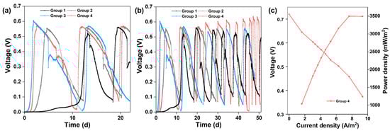 (a) Start-up voltages of different groups. (b) Long-term MFC stability of different groups. (c) Polarization and power density curves of Group 4.