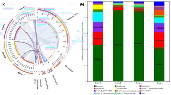 16S rRNA gene analysis was employed again to compare microbial communities residing in different anode biofilms. As shown in Figure 7a, at the phylum level, six bacterial phyla were identified with over 1% relative abundance and the dominating phyla were Desulfobacterota, Bacteroidetes, and Spirochaetota. Further identification at the genus level is illustrated in Figure 7b; Geobacter as the representative EAB was significantly enriched on anode biofilm of Group 2 (88.94%), followed by Group 3 (88.13%), Group 1 (45.67%), and Group 4 (41.75%). Another kind of EAB of Microbacter decreased in the anode biofilm of Group 2 (5.03%) and Group 3 (3.26%) and increased slightly in that of Group 4 (19.71%), compared to Group 1 (16.31%). Additionally, f_PHOS-HE36 of anode biofilm was a similar amount in Group 1 (12.47%) and Group 4 (11.15%).