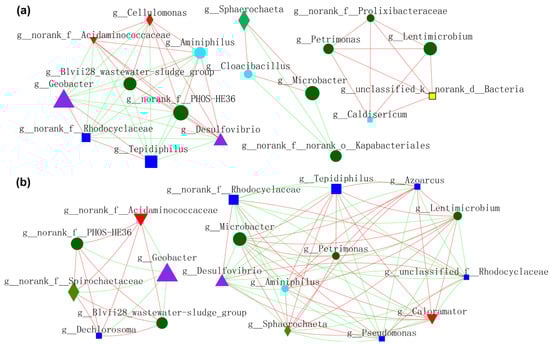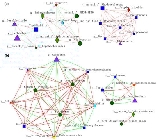 Molecular ecological networks (MEN) visualization dominated by (a) planktonic_CC and (b) planktonic_S10. Different colors and shapes of nodes signifier categories of phylum: Proteobacteria (deep blue diamond), Bacteroidota (deep green round), Desulfobacterota (purple triangle), Synergistota (sky blue round), Armatimonadota (yellow round), Firmicutes (red diamond), Actinobacteriota (red inverted triangle), Spirochaetota (light green diamond). A red edge indicates a positive interaction between two individual nodes, while a green edge indicates a negative interaction.