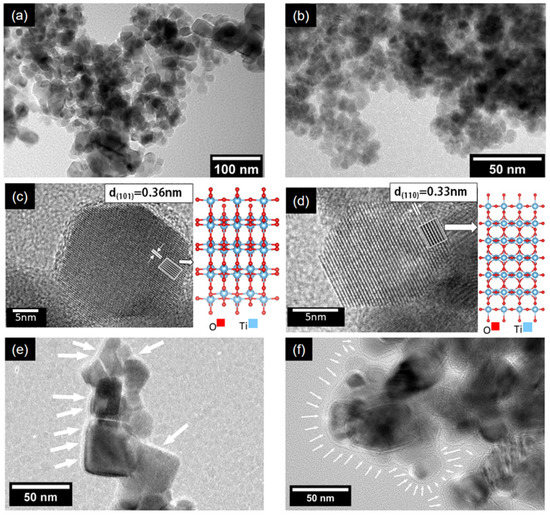 TEM images of the samples. P25 particle morphology at low magnification in (a,b). Anatase and rutile crystals in (c,d), respectively. Respective crystalline structure used to simulate the HRTEM images, right side of (c,d). Distances corresponding to the planes (101) and (110), respectively, indicated in a white box. In (e,f), particles of the reduced samples, BT(4.53) and BT(6.64), respectively. The layer of amorphous material observed in reduced samples is indicated with white arrows.