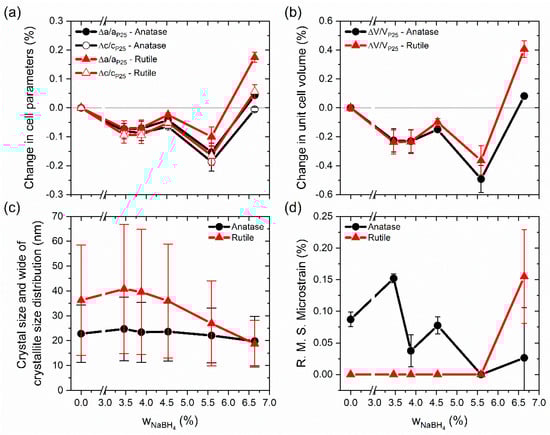 Changes in (a) cell parameters and (b) unit cell volume with respect to TiO2 P25. In (c), crystal size corresponds to a volume-weighted mean sphere diameter and distribution width (bars); (d) shows microstrain variation.