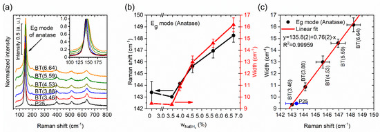 Additional structural information was obtained by Raman spectroscopy. Representative spectra of all samples are shown in Figure 3a. In general, the anatase phase spectrum was more intense than the rutile spectrum in all measurements, because the anatase phase is predominant. For the anatase phase, there are six Raman active modes: 3 Eg, 2 B1g, and 1 A1g [13]. The most intense band in the spectrum corresponding to the Eg mode at around ~144 cm−1 was examined. An outstanding outcome was that blue shifting and widening of the band were observed (as shown in Figure 3a,b) with the reducing agent’s increment; both effects can be caused by defects (nonstoichiometry, etc.) and a decrease in crystalline domain size [13,17]. According to Zhu, defects led to Raman frequency and bandwidth changes, because of the shortening of the correlation length of the phonons [51].