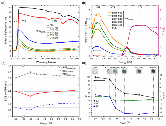 Optical characteristics were studied by diffuse reflectance spectroscopy in the ultraviolet/visible/near-infrared regions (see Figure 4). Reflectance spectra of the samples are shown in Figure 4a. For P25, the absorption edge was around 400 nm. The UV region was where P25 had minor reflectance, and the high values were in the visible and near-infrared regions. With the increment of the reducing agent, the prepared samples showed a decrease in their diffuse reflectance in the visible and, especially, near-infrared regions. Similar behavior has been observed in samples of TiO2 reduced with high concentrations of NaBH4 [17,38] or CaH2 [55].