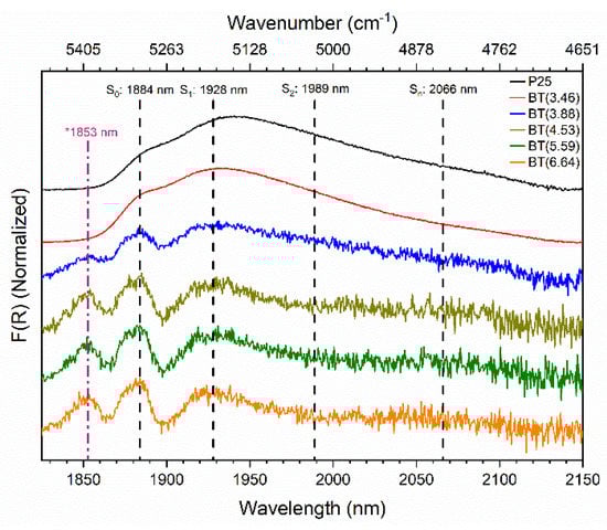 The samples P25 and BT(3.46) showed a band at 1456 nm (6868 cm−1) and another weak broad band at 1768 nm (5656 cm−1) (see Figure S8a). The first band was assigned to the combination band of the symmetric and asymmetric stretching (νsym + νasym) vibration modes of water. The second band can be attributed to a combination (νsym + νasym + νL) of stretching symmetric, asymmetric, and νL vibration modes of the water molecule [65] (νL was not defined in the reference, but it has been postulated to be an “intermolecular mode”). Additionally, the increment of the absorption towards 2500 nm could have been due to the presence of the water [66] (see Figure S8c). These bands disappeared in the reduced samples in which a > 3.46% was used for their preparation.