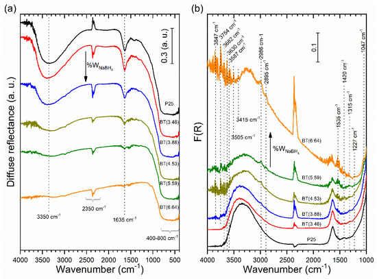 In general, the reduced samples showed the lowest diffuse reflectance values in the infrared region (not shown). Displaced infrared spectra are depicted in Figure 6. Spectra exhibited a band intensity decrease in the 400–800 cm−1 region, which was associated with the Ti-O-Ti stretching vibration mode in the crystal of TiO2 (see Figure 6a). This decrease can be attributed to different defects created by the reducing process (like oxygen vacancies, Ti3+, etc.), whose concentration increased with the amount of reducing agent used. However, these bands did not disappear entirely even in BT(6.64), thus demonstrating the preservation of the TiO2 crystalline core.