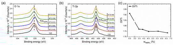 (a) Oxygen 1s and (b) titanium 2p spectra of the samples, where vertical dashed lines indicate the maximum peak for the P25 sample. (c) Structural oxygen/titanium ratio (OI/Ti) of the samples.