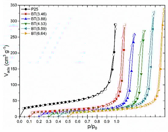 Textural characteristics of the samples were determined by nitrogen adsorption/desorption isotherms. Figure 8 shows the experimental isotherms for the set of prepared samples. The isotherms of the blue titania samples had the same shape and were similar to the shape of TiO2 P25. They exhibited a type II adsorption isotherm according to the updated IUPAC recommendations [80], which is typical for non-porous or macroporous solids. The type H3 narrow hysteresis loop indicates the presence of false particles’ macropores, which may reflect interglobular cavities resulting from the agglomeration of nanoparticles.