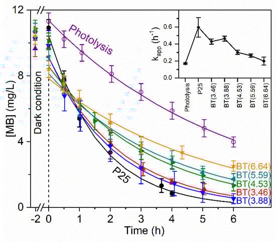 We observed the adsorption of MB in dark conditions and the trend was for this to increase with the degree of loss of hydrophilicity in the reduced samples. MB removal percentage by photocatalysis varied between 89% and 76% for BT(3.46) and BT(6.64), respectively. Values of adsorption by all samples and photolysis are indicated in Table S7. Although at first sight, these results may appear to be of no practical value, they strengthen knowledge about the role of the hydroxyl groups, the amorphous layer, a deficient oxygen surface in the generation of hydroxyl radicals.