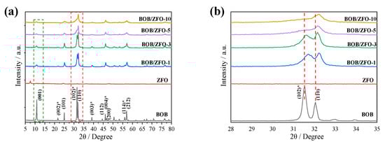 (a) XRD patterns of BiOBr, ZnFe2O4 and BOB/ZFO-x nanocomposites; (b) amplified XRD patterns of the samples. (The peaks with a “*” in (a) indicated that these peaks in the BOB/ZFO-x are decayed obviously compared with pure BiOBr. This is due to the induced effect of ferroelectric ZnFe2O4, which makes the (110) facet epitaxially grown, resulting in the decrease in the intensities of these peaks.