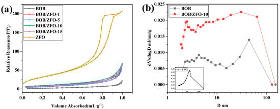 (a) Nitrogen adsorption–desorption isotherm and (b) the corresponding BJH pore size distribution of the BiOBr, ZnFe2O4 and BOB/ZFO-x composites.