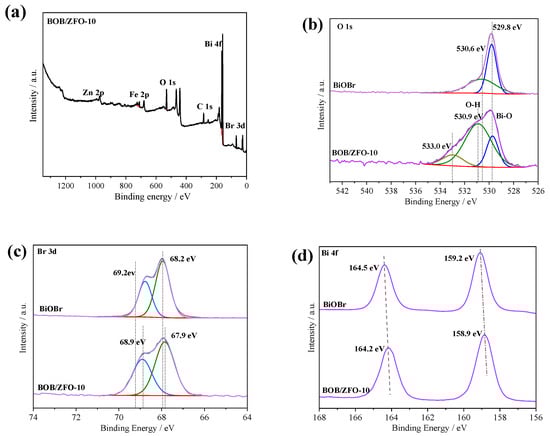 X-ray photoelectron spectroscopy (XPS) was used to detect the surface element state and chemical composition of the as-synthesized pure BiOBr and BOB/ZFO-10 nanocomposites (Figure 5). In Figure 5a, it can be clearly observed the elements of Bi, O, Zn, Fe, and Br are exhibited in the survey spectrum of BOB/ZFO, while the element of C 1s detected at 284.6 eV is used for correcting binding energy. It is worthy to note that no impurity elements were found in the full spectrum of the nanocomposite, indicating the successful preparation of the hybrids’ composite.
