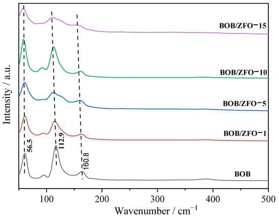 Raman spectroscopy is an appropriate technique for probing the local structure of materials because the bonding states in the coordination polyhedra of a material can be deduced directly from the Raman vibrational spectrum. Raman spectra of the synthesized pure BiOBr and BOB/ZFO with various ratios of ZFO were recorded to identify the local structure information (Figure 6). The peaks at 56.5 cm−1, 112.0 cm−1 and 160.8 cm−1 in the spectrum of pure BiOBr are attributed to A1g Bi-Br external stretching, A1g Bi-Br internal stretching and E1g Bi–Br internal stretching, respectively [24,38].