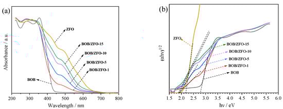 The diffuse reflectance UV-Vis spectra (DRS) can be used to determine the band structure of semiconductor materials, from which the photophysical properties of the synthesized materials might be measured. The optical absorption properties of BiOBr, ZnFe2O4 and BOB/ZFO-x composites were measured by UV-Vis diffuse reflection spectra (DRS) in the wavelength range between 200 and 800 nm. As shown in Figure 7a, all the samples of BiOBr, ZnFe2O4, BOB/ZFO-1, BOB/ZFO-5, BOB/ZFO-10 and BOB/ZFO-15 exhibited favorable absorbance of light from ultraviolet to visible light. The absorption edge of BiOBr is 430 nm, which is in agreement with that previous reported. However, two absorption edges for pure phased ZnFe2O4 at about 610 nm and 850 nm can be observed. This indicates that ZnFe2O4 is capable of absorbing a broad spectrum of solar light, particularly visible light. It is worthwhile to note that the absorbance edge of the BOB/ZFO-x hybrid heterojunction showed a remarkable redshift with respect to pure BiOBr and a blueshift against pure ZnFe2O4.