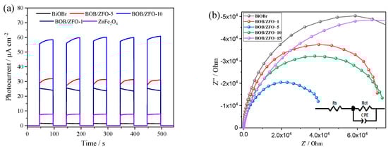 Generally, the separation, transmission, and recombination of photoinduced charge carriers were considered the key influence factors in determining photocatalytic performance [39,40]. Therefore, the photoelectrochemical characterizations of BiOBr, ZnFe2O4 and BOB/ZFO-x nanocomposites were investigated by transient photocurrent−time spectra (I–t) and electrochemical impedance spectroscopy (EIS). The results are shown in Figure 8a and Figure 8b, respectively. As described in Figure 8a, pure BiOBr and ZnFe2O4 displayed inferior intensive photocurrent due to the rapid recombination of their photogenerated carriers. After BiOBr nanosheets were closely adhered to the surface of ZnFe2O4 nanoparticles, the intensities of the photocurrent responses of BOB/ZFO-x was considerably improved compared to those of pure BiOBr and ZnFe2O4, indicating that the core-shell heterojunction structure accelerated the separation and transmission of interface photoelectron-hole pairs, with the highest photocurrent intensity of composites being 26.2 times that of BiOBr. This result is not only attributed to the formation of a heterojunction between BiOBr and ZnFe2O4, but also due to the distortion of BiOBr local structure induced by ZnFe2O4 during the synthesis process.