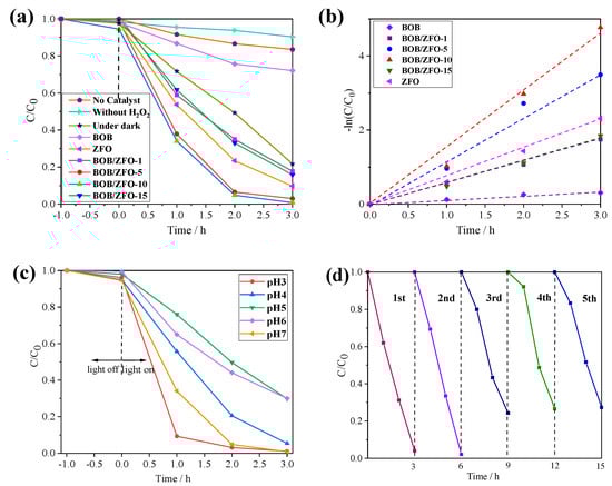 (a) TCH photodegradation activity over as-fabricated samples under visible light (λ > 420 nm); (b) the pseudo-first-order kinetic rate constants over all materials; (c) TCH photodegradation activity under various pH conditions (BOB/ZFO-10); (d) cycling degradation curves of TCH for BOB/ZFO-10 sample.