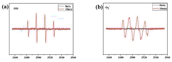 ESR measurements can offer information to determine the reactive radicals in the photocatalytic system. The results are shown in Figure 10. It is clear that no obvious ESR signals of DMPO − ˙O2− and DMPO − ˙OH were observed in the darkness condition. As can be seen from Figure 11, after 10 min irradiation of visible light, both signals of ˙O2− and·OH were detected by BOB/ZFO-10. Since the ECB of ZnFe2O4 is more negative than the redox potential (−0.33 eV) of O2/˙O2−, the photogenerated electrons in the CB of ZnFe2O4 can reduce O2 to produce ˙O2−. For ˙OH, the valence band of BiOBr is negative to the redox potential of H2O/˙OH (2.38 eV), and photogenerated holes in the valence band cannot oxidize H2O to ˙OH. In fact, ˙OH was provided by photo-Fenton reaction. The formula is as follows:
