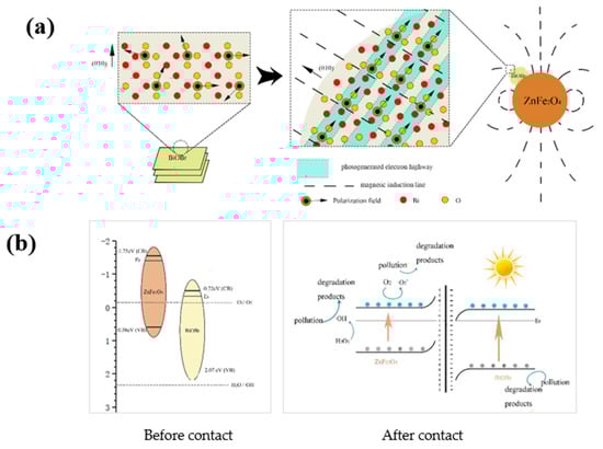 In the self-assembly process of BiOBr, the ferroelectric ZnFe2O4 plays roles not only as a crystal attachment point, but also in the intrinsic ferroelectromagnetism affecting the surface morphology [47], crystal facet growth and the direction of the internal polarization field of BiOBr during the material assembly, as in Monzon‘s work [48]. In other words, when BiOBr is synthesized by this process, during the self-assembly process, instead of tending to be a nanosheet structure, the crystal formation of BiOBr is induced by a weak magnetic field around ZnFe2O4 and a spherical structure with less surface energy is formed around the ZnFe2O4 crystalline nucleus. Simultaneously, the anions and cations are migrated according to the distribution of the magnetic field, forming a uniformly oriented polarization field with orientation (010). As shown in Figure 11a, the uniformly oriented polarization field provides a photogenerated electron highway (PGEH) for the transfer of electrons. The electrons passing through the PGEH exhibit a higher transfer efficiency and a lower recombination probability. This result agrees well with the significant increase in the photocurrent as well as a short Nyquist radius (Figure 8).