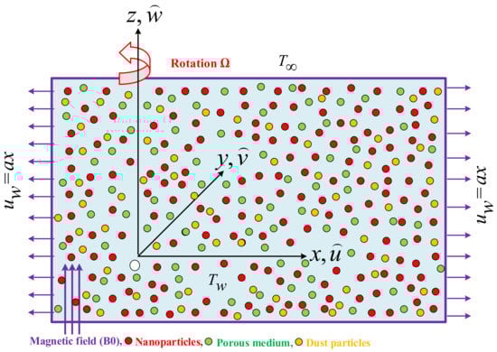 A three-dimensional laminar rotating flow of incompressible dusty Maxwell, the dynamics of water conveying copper nanoparticles over a stretching sheet, is assumed. The sheet is stretched in the -plane, with fluid placed along the z-axis. Fluid rotates about the z-axis with constant velocity . Initially, both dust particles and fluid are supposed to be static. The dust particles are considered uniformly sized spheres, and their density is assumed to be constant throughout the stream. Moreover, the ambient temperature of fluid and temperature at the surface are and , respectively. Figure 1 demonstrates the coordinate system and flow characteristics. Further, we assume that the thermophysical properties of nanoparticles and base fluid are mentioned in Table 1 and Table 2; there is no slip occurring between the tiny particles, and Cu tiny particles and the host fluid are in thermal equilibrium. The fluid is synthesized as a stable compound and sedimentation of particles is ignored. The mathematical model for the flow of the dusty phase, coupled with the constraints, is as follows, based on these physical assumptions and boundary layer approximations [,,].