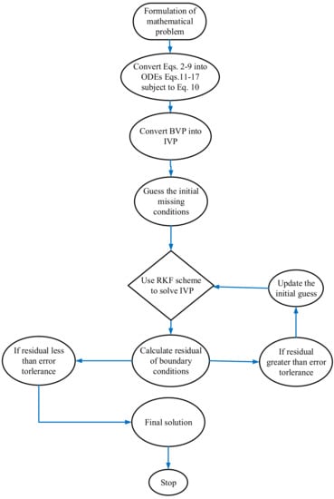 A system of ordinary differential equations represents the flow model. Algorithms (11)–(16) are numerically solved using the effectiveness and strength of numerical computing in the Runge-Kutta approach using MATLAB. Refs. [,] provides more details on this solution approach (see Figure 2). The graphical and numerical results show the velocity and temperature fields as different physical factors. The Runge–Kutta technique is used to transform the system of ODEs (11)–(16) into first-order ODEs for a solution: