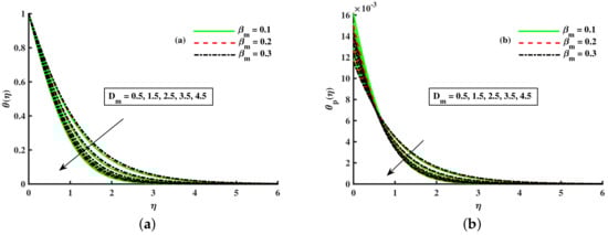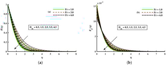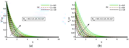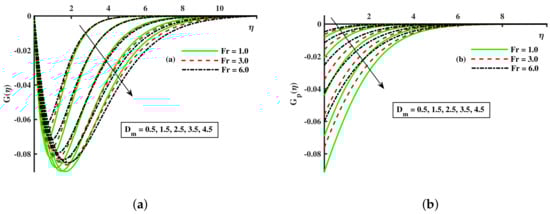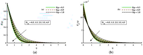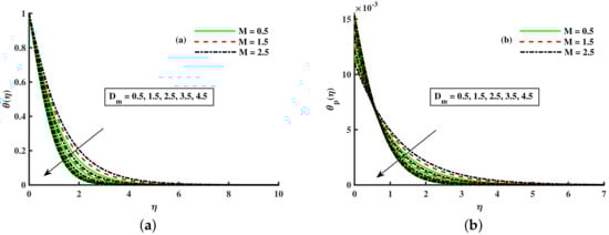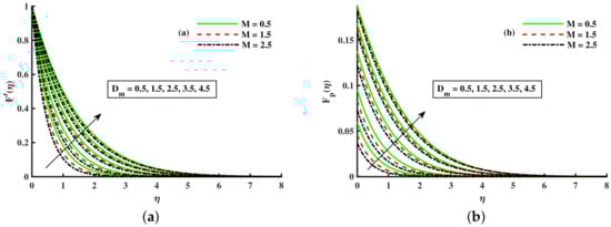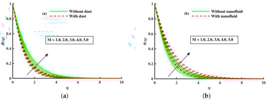 Figure 3a,b and Figure 4a,b depict that the momentum boundary layer of the transport phenomenon rises as the nanoparticles’ radius increases. Meanwhile, an increase in the nanoparticles radius causes an increase in friction throughout the layer along the rotating surface; this is because, as Namburu et al. [] pointed out, increasing the diameter of nanoparticles, the velocity increases during the thermal boundary layer show opposite behavior for fluid and dust particles. On the other hand, the velocity and thermal boundary layer are for various inputs of the magnetic parameter. Here, signifies momentum in the x-direction for the fluid phase, and demonstrates the momentum boundary layer in the x-direction for the dust phase, respectively. It can be seen that the velocity lowered while the temperature boundary layer rose with improving the M inputs. The influence of a magnetic field on an electrically conducting fluid causes the resistive force that tends to reduce the momentum while increasing the thermal boundary layer. Because of this, the magnetic field impact has a wide range of control-based applications, including magnetohydrodynamic ion propulsion, electromagnetic metal casting, magnetohydrodynamic power production, etc. The velocity and thermal boundary layer for different inputs of the diameter of nanoparticles are portrayed in Figure 5 and Figure 6. Here, signifies the momentum along the x-axis while is the momentum along the y-axis for the fluid phase, and deliberates the momentum of the x-axis while represents the momentum in the y-axis for the dust particles, respectively. It is observed that the momentum profile decreased. The reduced viscosity of water-based nanofluid caused due to a larger copper nanoparticles radius leads to a rise in momentum at all levels of energy flow due to the concentration gradient. When the energy flow owing to the concentration gradient is sufficient in magnitude, a drop occurs in temperature distribution over the domain. The other side shows the impact of the rotation parameter on the momentum and thermal boundary layer of the fluid and dust particles. The velocity along the x-direction declines and in the y-direction, it enhances fluid and dust particles with improving . Thus, an improving thermal distribution of fluid and dust particles is depicted in Figure 7a,b.
