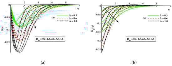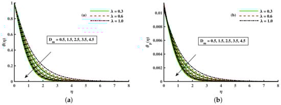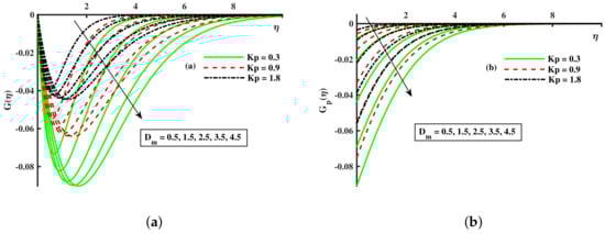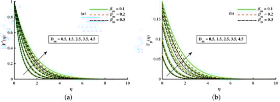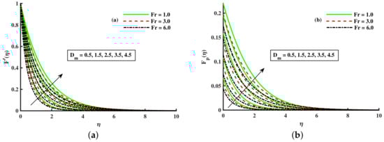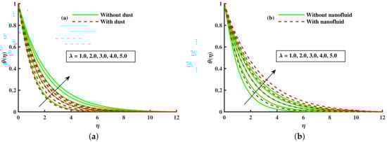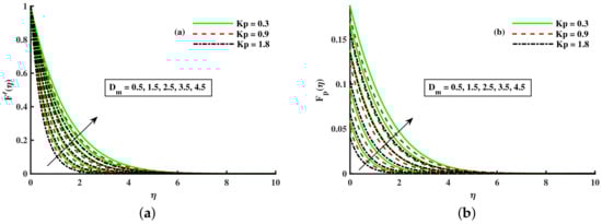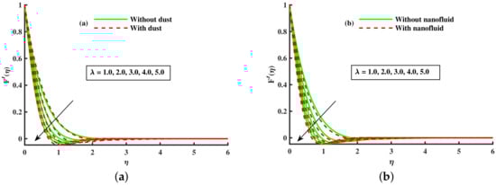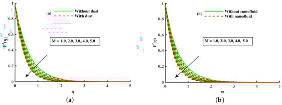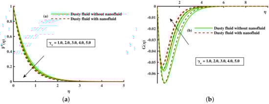 Figure 14a,b portrays the momentum boundary layer and thermal boundary layer for various inputs of . The axial velocity depreciation occurs with enhanced . It is caused because the higher values of present a stronger viscous force, which causes a depreciation in the flow and, hence, velocity () decline. We observed that distributions are tilted toward the boundary when is enhanced. Figure 15a,b depicts the curve of thermal boundary layers for different inputs of . It is observed that the penetration depth of the thermal boundary layers is enhanced by improving . Figure 16a,b depicts that the magnitude of the momentum boundary layer of the transport phenomenon decreases as the fluid particle interaction parameter () increases. Further, it is noted from this figure that the magnitude of the primary and secondary dusty fluid velocities are lesser in the dusty nanofluid case as compared to the dusty phase when nanoparticles are ignored. Figure 17a,b and Figure 18a,b show the influence of M and on the dynamic of the base fluid velocity with and without dust, and nanofluid, respectively. It is observed that the momentum profile is decreased against higher input of magnetic and rotating parameters, but the momentum profile exhibits more decline when dust particles and nanoparticles are incorporated in the base fluid.