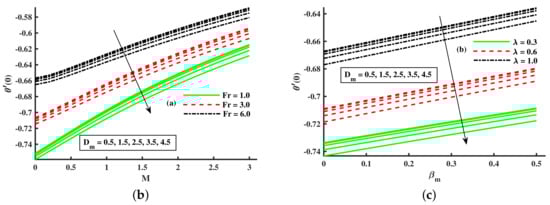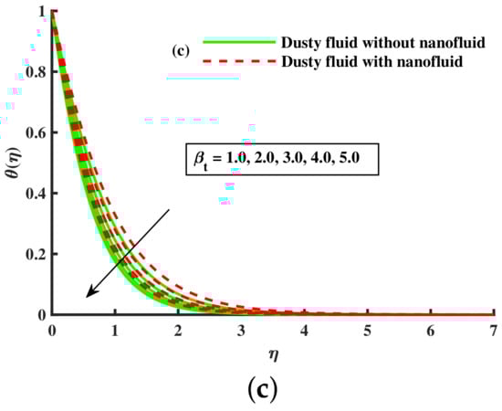 From Figure 19 and Figure 20a–c, the influence of M, , & on the characteristic of base fluid temperature () is discussed. We discuss two separate cases (with and without dust, and with and without nanofluid) in these two diagrams. We can see from these two diagrams (Figure 19 and Figure 20a,b) that the base fluid temperature rises against the growing strength of magnetic and rotating parameters values, and the nanofluid phase also raises the base fluid temperature, but the opposite trend is observed for the dust particles phase. Physically, the addition of nanoparticles enhances the temperature due to the extraordinary property to enhanced the base fluid temperature. Experts in thermal engineering have embraced the effectiveness of nanofluids due to the improvements in heat transmission throughout fluid movement. Furthermore, Figure 20c shows the decline in the thermal boundary against higher values of and nanofluid phase. The nanofluid phase enhances the thermal boundary layer as compared to that without the nanoparticles phase. Physically, the addition of nanoparticles enhances the temperature due to the extraordinary property to enhanced the base fluid temperature. Figure 21a,b portrays the Nusselt number for various inputs of , magnetic , and rotating . The Nusselt number is decreased negatively against higher values for higher values of , magnetic , and rotating , but the opposite behavior is reported against the nanoparticles radius.