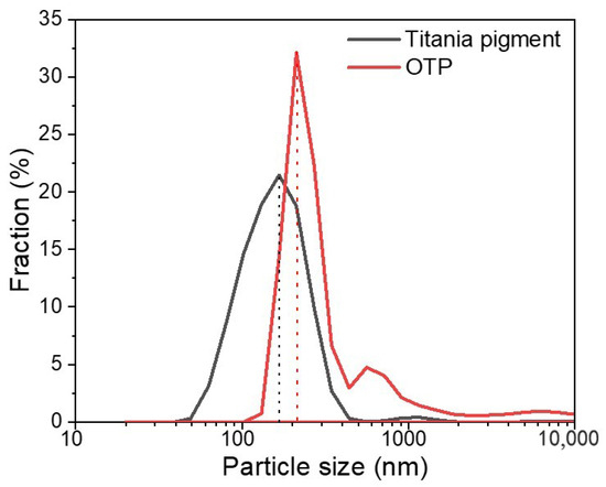 Particle size distribution of titania pigment and OTP in deionized water.