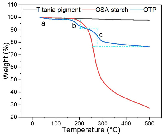 Figure 3 showed the weight loss of titania pigment, OSA starch and OTP under tested TG analysis condition (in the temperature range of 0 to 500 °C). A continuous and slight weight loss for titania was observed after 100 °C, which may be attributed to degradation of impurities from titania pigment. It has been reported previously that titania pigment was heat resistant material [1]. There was about 1% of weight loss in total within 100 °C. After 100 °C, the loss was about 2% of total weight. OSA starch is mainly carbohydrate with the water absorption capacity [7], the weight loss within 100 °C could be due to the loss of moisture (Figure 3). From 200 to 300 °C, hydroxy structures of OSA starch started to degrade [33], resulting in a rapid reduction in weight (Figure 3). Further increases in temperature also led to a large amount of weight loss, and at the end of heating, only 25% of the original weight remained. At temperatures above 200 °C, OSA starch would reach the degrading point and the decomposition of the macromolecules occurred [34]. For OTP, the weight loss can be divided into three main stages according to Figure 3. Initially, moisture was evaporated from particle and caused slight weight loss below 100 °C (stage a in Figure 3). When the temperature was higher, OSA starch layer began to lose weight (stage b). After 200 °C (stage c), the OSA starch layer degraded and OTP particles lost weight drastically. After 400 °C, it could be predicted that mainly naked titania pigment was left, and no more weight loss was observed. OTP mainly comprised OSA starch and titania pigments, in addition to some sticky moisture. According to the blue line (OTP), after 450 °C, around 75% of weight were remained. According to the black line (titania pigment), after 450 °C, around 2–3% of moisture evaporated. At 100 °C, OTP lost about 1% of moisture. Compared to titania, it could be predicted that OSA starch layers contributes to 22% of the total weight.