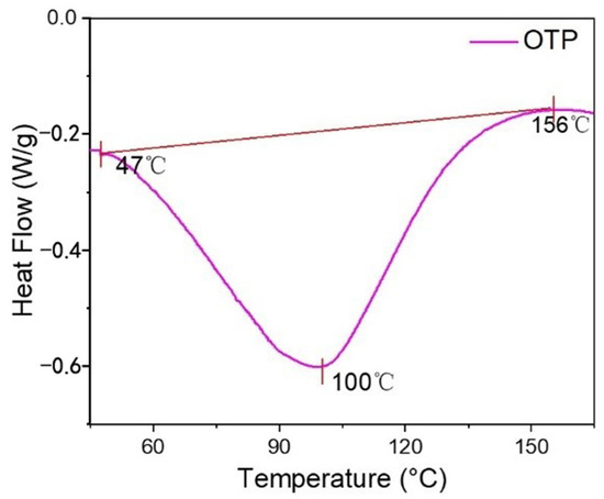 The calorimetric thermograms of OTP was depicted as a graph of heat flow (W/g) versus temperature (°C) and shown in Figure 4. The onset temperature, glass transition temperature (Tg), and offset temperature were around 47 °C, 100 °C and 156 °C, respectively [35]. Generally, the onset temperature was accepted as melting temperature at which OTP particle started to change its physical form at 47 °C. This was attributed to the chain unfolding or re-arrangement of the OSA starch layer. At 100 °C, OTP reached the glass transition temperature, indicating that the starch coated on titania started to transform from glass state to a higher elastic state until 156 °C. Below 47 °C, OTP was remained in a stable shape, whereas its quality was seriously damaged after 100 °C.