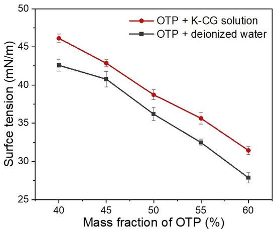 Figure 6 demonstrated the surface tension of OTP dispersed in both a κ-CG solution and water [36]. With the increasing content of OTP, their surface tension decreased drastically (Figure 6). Similarly to contact angle analysis, OTP dispersed in a κ-CG solution showed a higher surface tension than that in pure water. The increased contact angle meant a higher interfacial energy between solution and the surface. This change may be caused by the presence of κ-CG as compared with pure water suspension. As κ-CG is often used as a thickener, it can produce a weak network in water-based solution [11]. The contact angle and surface tension analysis demonstrated that OTP dispersed in a κ-CG-based solution showed a higher hydrophilicity and liquid molecular cohesion, suggesting that a κ-CG aqueous solution was more suitable for OTP stabilization and dispersion.