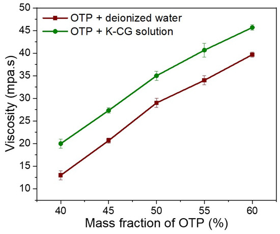 Viscosity in dispersing OTP in deionized water and K-CG solution.