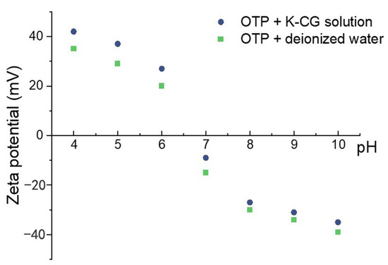 Zeta potential of dispersing OTP in water and K-CG solution.