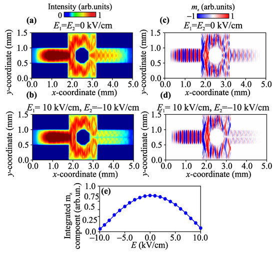 Next, using a micromagnetic calculations based on the solution of the Landau–Lifshitz–Gilbert equation [47,49], we investigated a voltage-controlled transformation of spin-wave dynamics and interference. The parameters of the YIG were: saturation magnetization G, exchange constant pJ/m, and Gilbert damping . The damping at the ends of the simulated structure and the high damping absorber was set to exponentially increase to 0.5 to prevent spin-wave reflection. The static magnetization oriented itself perpendicular to the MZI spontaneously to excite an MSSW. The mesh was set to m. To excite propagating spin waves, a sinusoidal magnetic field was applied over an area of 100 m in length, with a varying oscillation amplitude and microwave frequency f. The of each cell was collected over a period of 300 ns, which is long enough to reach the steady state. The fluctuations were calculated for all cells via , where corresponds to the ground state. The influence of the external electric field was taken into account by creating regions with a reduced (increased) value of the internal magnetic field in the regions of the interferometer branches. The left column of Figure 2 shows the SW intensity distribution in the case of MSSW excitation at GHz. It should be noted that such a configuration of magnonic structure allows us to realize a NOT logic function. SWs generated from the one end are allowed to be split into the top and bottom branches and then merged to interfere on the other end, without or by applying an electric field to the PZT layer. In the case of zero electric fields kVcm, representing the logical input, the two merged SW beams constructively interfere with each other due to the lack of differences in phase (see Figure 2c,d) and amplitude (see Figure 2a,b) between the two, representing the “1” logical output seen at the top of Figure 2a. By contrast, with electric fields of kV/cm and kV/cm, the split SWs are merged to destructively interfere on the right end because they, after passing the upper and lower branches, become out of phase with each other, signifying the 0 logical output in Figure 2b. To demonstrate an efficiently voltage-controlled variation in spin-wave amplitude and phase, we plot an integrated value of dynamic magnetization -component in the output section (in the cross section mm) as a function of the external electric field applied to the PZT layer at the fixed frequency GHz. As a result, the phase shift , created during the separate SW propagation between the top and bottom branches, is given by , where and are the SW dispersions in the top and bottom branches of MZI. The value can be controlled by varying E and is also variable for different f, as seen in Figure 2e. Applying a positive or negative electric field leads to a decrease in the magnitude of the phase and amplitude in the output section of the MZI in a periodic manner. Thus, we can obtain a voltage-controlled switching of spin-wave amplitude and phase in the proposed MZI.