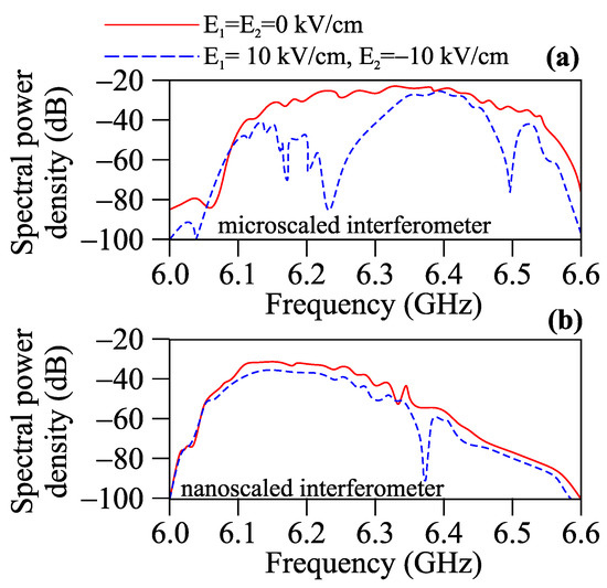 At the same time, nano-scale single-mode magnonic waveguides can also overcome the issue of parasitic magnon scattering into higher modes. Furthermore, reducing the dimensions of magnonic structures to the atomic scale could potentially shift the frequency of the spin waves from the GHz to the THz range. Next, let us consider a MZI in at a sub-micron size. To simulate the processes of the propagation of spin-wave excitations in a nano-scale MZI, the following dimensions were chosen: the width m, thickness t = 40 nm, and length m. The width of the microwave signal excitation source was 500 nm. A sinc-field pulse , with an oscillation field of Oe and a cutoff frequency of GHz, was used to excite a wide range of spin waves. To compare the micro- and nano-scaled MZIs, we plotted the frequency-dependent spectral power densities for a previously considered micro-scaled MZI (see the red solid curve in Figure 3a) and nano-scaled MZI (see the red solid curve in Figure 3b). A decrease in geometric dimensions leads to an increase in the effect of shape anisotropy for nano-scale waveguides. This leads to the transformation of the transmitted spin waves through the MZI. Applying an external electric field (see the blue dashed curves in Figure 3) for a nano-scale MZI leads to a variation of the frequency dips in the spin-wave transmission, which correspond to destructive interference at the output.