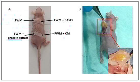 The grafting was carried out on mice, anesthetized by isoflurane inhalation, by making 0.5 cm incisions in the backside, between the muscle and subcutaneous layer, and using a syringe with a luer-lock connector and a flexible injector. The grafts consisted of: (1) Integra® FWM hydrated with fresh culture medium depleted of FBS; (2) Integra® FWM hydrated with fresh culture medium containing 3 × 106 hASCs; (3) Integra® FWM hydrated with fresh culture medium containing crude protein extract derived from 3 × 106 of hASC; (4) Integra® FWM hydrated with hASC-CM derived from 3 × 106 cells. Each syringe contained a total volume of 3 mL of each formulation, and a volume of 200 μL, for each preparation, was injected in any single animal. Incisions were then stitched using surgical sterile strips (Figure 1A).