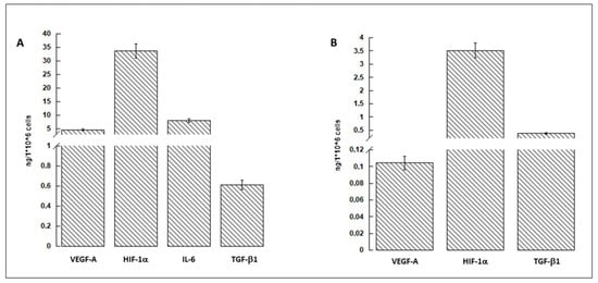 The characterization, in terms of most known growth factors, of conditioned medium (CM) and protein cell extract, conducted by ELISA, is displayed in Figure 2. The data showed that the amount of HIF-1α was the most abundant both in CM (panel A) and in protein cell extract (panel B). VEGF-A, IL-6, and TGFβ1, although present in smaller quantities, were still represented in CM.