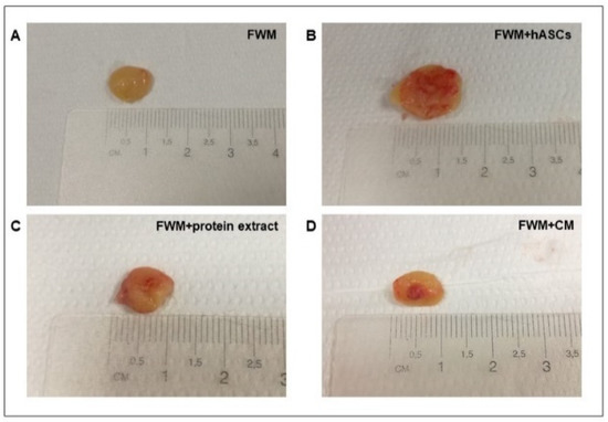 Representative images of macroscopic scaffold analysis after animal sacrifice. All the samples appeared yellow, soft on palpation and of comparable size. (A) FWM alone: the vascularization is almost absent. (B) FWM combined with hASCs. (C) FWM combined with cell protein extract. (D) FWM combined with cell-conditioned medium. In formulations (B–D), the vascularization was more evident and present also inside the scaffold.