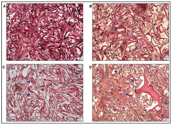 Representative microscopic images of scaffold specimens stained with hematoxylin–eosin. (A) FWM alone: observe the presence of collagen fibers and the absence of vessels. (B) FWM combined with hASCs. (C) FWM combined with cell protein extract. (D) FWM combined with cell-conditioned medium. In panels (B–D), in addition to collagen fibers, the presence of numerous cell nuclei (probably of fibroblasts) and capillaries full of erythrocytes (indicated by the blue arrows) are notable.