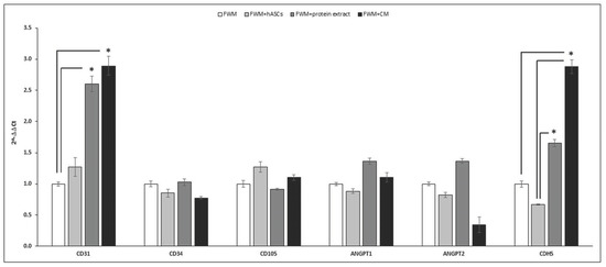 The relative gene expressions of CD31, CD34, CD105, ANGPT1, ANGPT2, and CDH5 are reported in Figure 6. The most relevant results refer to the mRNA expression of CD31 and CDH5 that appeared higher in the scaffold loaded with conditioned medium (black bar) and in the one with cell protein extract (dark grey bar) compared to FWM alone. No significant differences were observed for CD34, CD105, and ANGPT1 and 2 (p < 0.05).