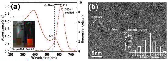 The calculated size (3.84 nm) is consistent with the value (3.87 nm) estimated from the HRTEM image shown in the inset of Figure 2b. Moreover, the small Stokes shift (about 170 meV) between the excitonic absorption edge and the PL emission peak indicates the good quality of our QDs.
