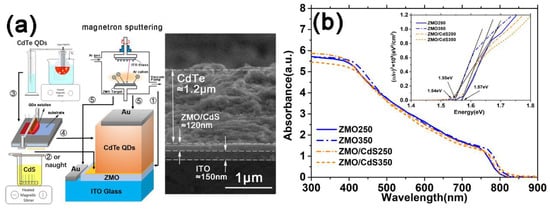 Based on the ZMO and ZMO/CdS window layer, we deposit CdTe QDs by the blade coating method to form optoelectronic heterojunctions. Then, we complete the solar devices with the structure of Glass/ITO/ZMO/CdTe(QDs)/Au and Glass/ITO/ZMO/CdS/CdTe(QDs)/Au. The entire fabrication process and device configuration of solar cell are shown in Figure 3a with a cross-sectional SEM image of the actual multilayer with the structure Glass/ITO/ZMO/CdS/CdTe(QDs). The thickness of each layer is marked in the image. As is well known, the annealing process is crucial to improving the CdTe device performance [23], especially for solution-processed CdTe QDs solar cells, which was confirmed by Qin et al. [9]. Thus, both multilayers with two different structures were deposited and CdCl2 annealed at low (250 °C) and high (350 °C) temperature to study the effect of the annealing process on the performance of the corresponding devices. Figure 3b shows the absorbance spectra of these four multilayers. ZMO250 and ZMO350 represent the multilayers with the same structure of Glass/ITO/ZMO/CdTe(QDs) but different annealing temperature (250 °C and 350 °C). Meanwhile, ZMO/CdS250 and ZMO/CdS350 represent the multilayers with the same structure of Glass/ITO/ZMO/CdS/CdTe(QDs) but different annealing temperature. The absorbance (A) is calculated with transmittance (T), using the formula: