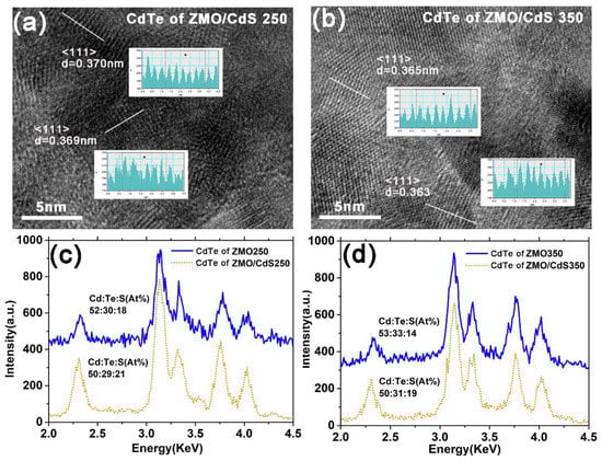 The HRTEM images of (a) CdTe in ZMO/CdS250 multilayer and (b) ZMO/CdS350 multilayer. The inset of (a,b) shows the measured interplant distance of CdTe crystalline. EDX patterns of (c) CdTe of ZMO/CdS250 multilayer and (d) ZMO/CdS350 multilayer. The atomic ratio of Cd:Te:S is listed near EDX patterns.