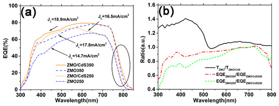 The effect of the ZMO mono-window layer and the ZMO/CdS bi-window layer on the carrier collection is investigated with the EQE spectrum. As shown in Figure 6a, the EQE of the device based on the ZMO/CdS bi-window layer (ZMO/CdS250 and ZMO/CdS350) are larger than that based on the ZMO mono-window layer (ZMO250 and ZMO350) at short wavelength before 650 nm. This is an unexpected result, because the transmittance of the mono-window layer is larger than that of the bi-window layer, especially in the short wavelength range (Figure 1b). In order to isolate the influence of the carrier collection on the EQE, we calculate the specific value of transmittance of the ZMO mono-window layer to the ZMO/CdS bi-window layer (TZMO/TZMO/CdS) and the specific value of EQE based on these two different window layers (EQEZMO/EQEZMO/CdS) in the range of the entire wavelength. As shown in Figure 6b, the transmittance ratio, TZMO/TZMO/CdS, is quite large before 520 nm due to the optical absorption above the band gap of CdS, as expected. However, both the EQE ratio of devices annealing at low temperature (EQEZMO250/EQEZMO/CdS250) and high temperature (EQEZMO350/EQEZMO/CdS350) exhibit a value that is smaller than 1. This means the photoelectric conversion of the device based on the ZMO mono-window layer is less than that based on the ZMO/CdS bi-window layer.